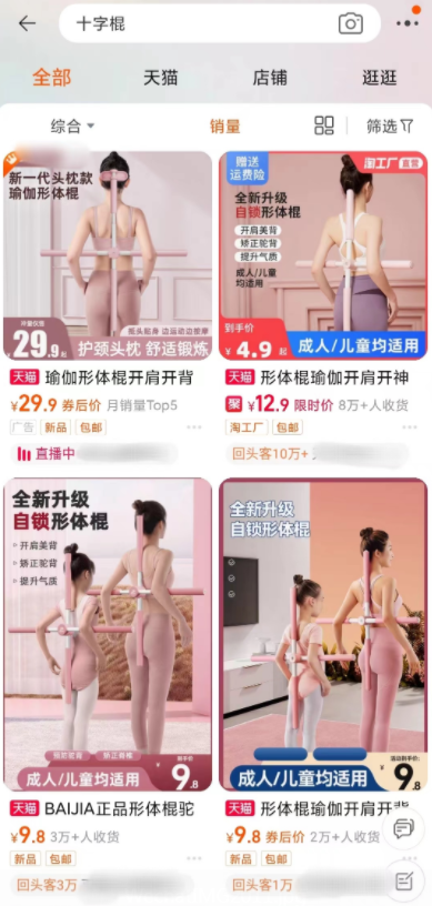 “形体老师推荐,每天十分钟,塑造优雅气质”“使用前视觉身高165cm,使用后视觉身高170cm”…… 在电商平台输入“十字棍”“形体棍”等关键词,就会跳出数十个相似的十字形交叉矫正器。该类商品售价多在十几元至三四十元不等,有的产品月销量已超过10万件。