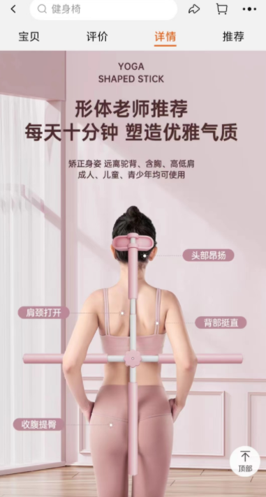 一月销量在3万件以上的商品详情中,写着“矫正身姿,远离驼背、含胸、高低肩”等字样,还标注着“成人、儿童、青少年均适用”。客服称,该产品的使用方法为,将木棍交叉放置,卡扣卡住,站姿。要双脚并拢,膝盖夹紧,小腿肌肉收紧,大腿肌肉上提,臀部夹紧,收腹挺胸后与形体棍贴合。客服称,每天坚持10至20分钟,坚持1个月左右就有明显效果。