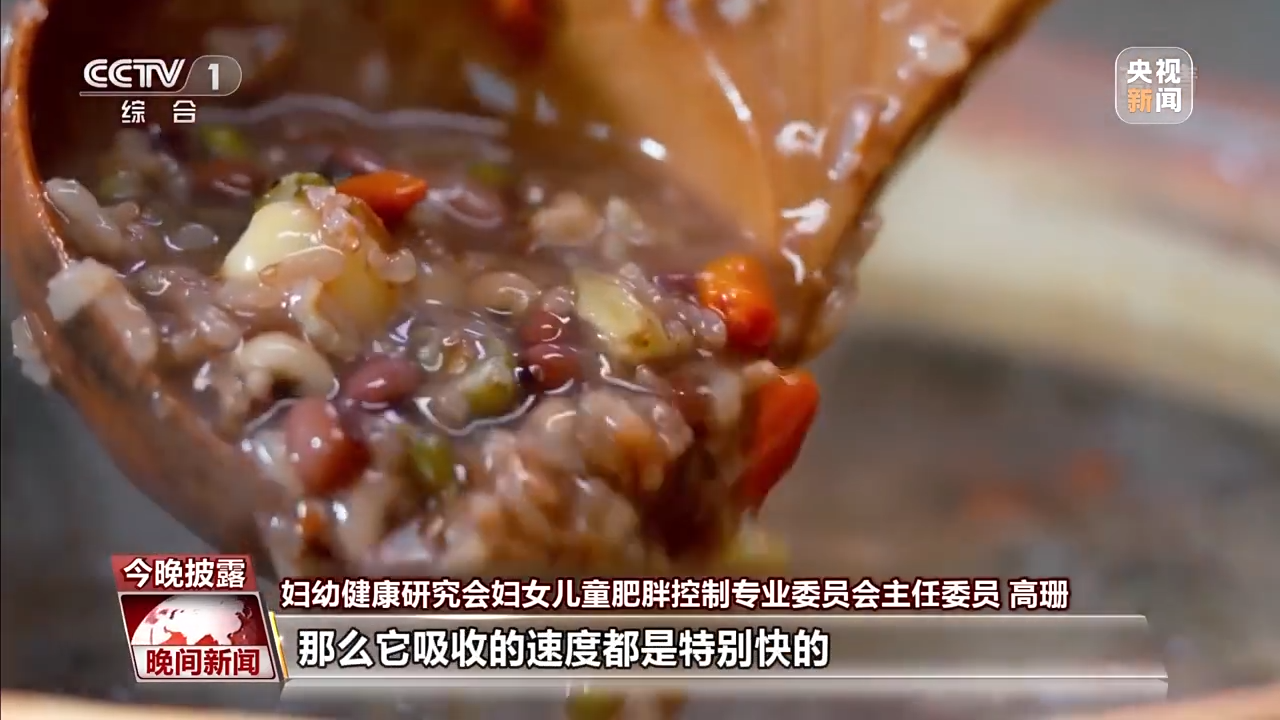 妇幼健康研究会妇女儿童肥胖控制专业委员会主任委员 高珊:最常见的就是大家喝的粥,无论是米粥,还是加了杂粮的粥,它由于熬煮的时间长,植物细胞壁的破坏,它吸收的速度都是特别快的。