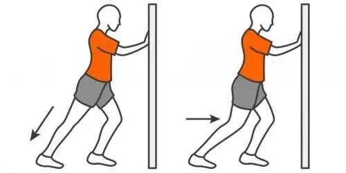 站立保持双脚平放在地上,向前弯曲前膝,同时保持后膝伸直,保持这个姿势30秒,感受小腿肚肌肉的拉伸,可重复进行;