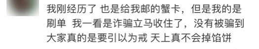 收到一张蟹卡,结果却是诈骗,此事一度冲上热搜。网友纷纷评论:“我也收到过!”“提高警惕,天上不会掉馅饼!”