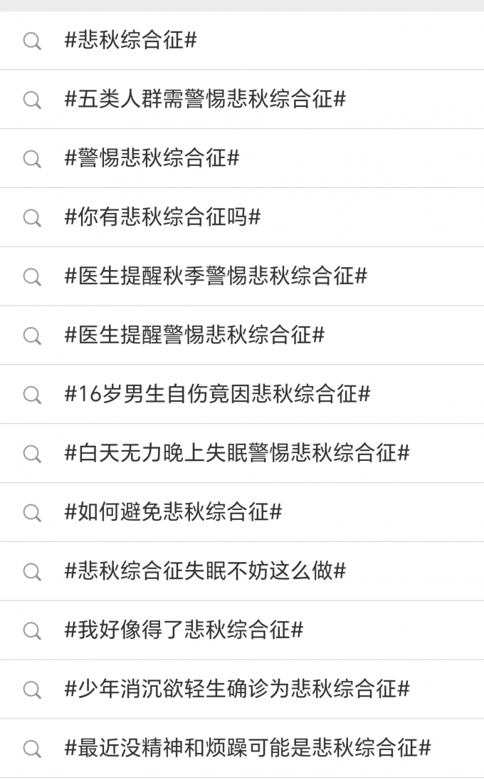 “入秋后日照减弱,大脑松果体分泌褪黑素相对增加,使人容易疲劳。其次气温降低抑制了人体甲状腺素和肾上腺素的分泌,导致人体兴奋性降低,人体还没来得及适应其变化,就会出现情绪低落,多愁善感,容易疲劳的症状。”据省中西医结合医院相关专家介绍,“悲秋综合征”一般在精神上表现为易疲劳、精力减退、注意力分散、做事力不从心等,严重者可出现食欲下降、失眠等症状。情绪上往往容易产生迷茫、孤独和无助之感。身体上可能会出现头痛、头晕、胸闷气短、心悸心慌的症状,有部分患者还会出现记忆力、反应力下降,行动迟缓,体重下降。