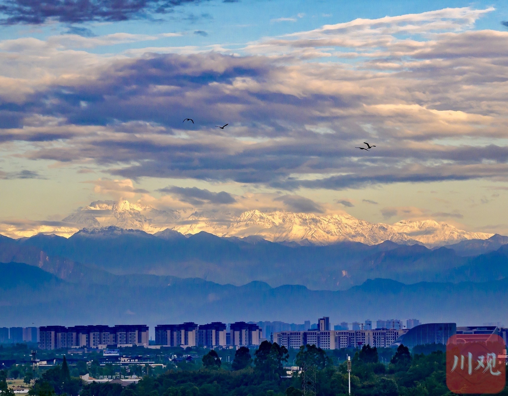 成都西面的雪山映衬朝阳。欧阳杰 摄