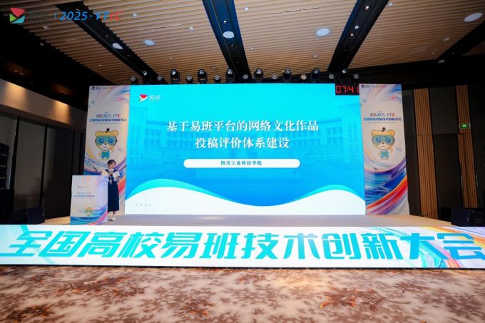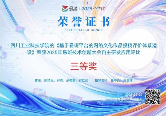 近日,教育部易班发展中心主办的2025年全国高校易班技术创新大会在珠海圆满落幕。由崔书磊、高渝林老师指导,陈婧泓、尹青、佘荷黎、罗红燕四位同学完成的《基于易班平台的网络文化作品投稿评价体系建设》项目荣获自主研发应用全国三等奖。